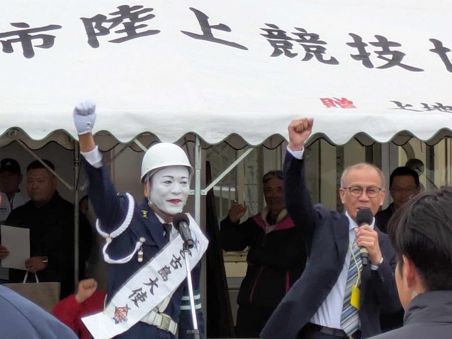 選手の皆様の健闘を祈り、市長と一緒にワイドー三唱をさせていただきました!!